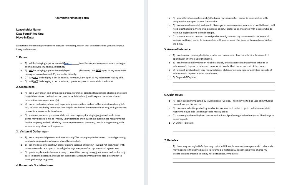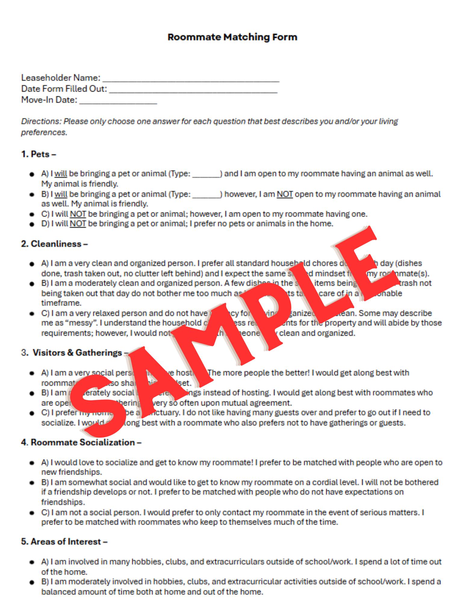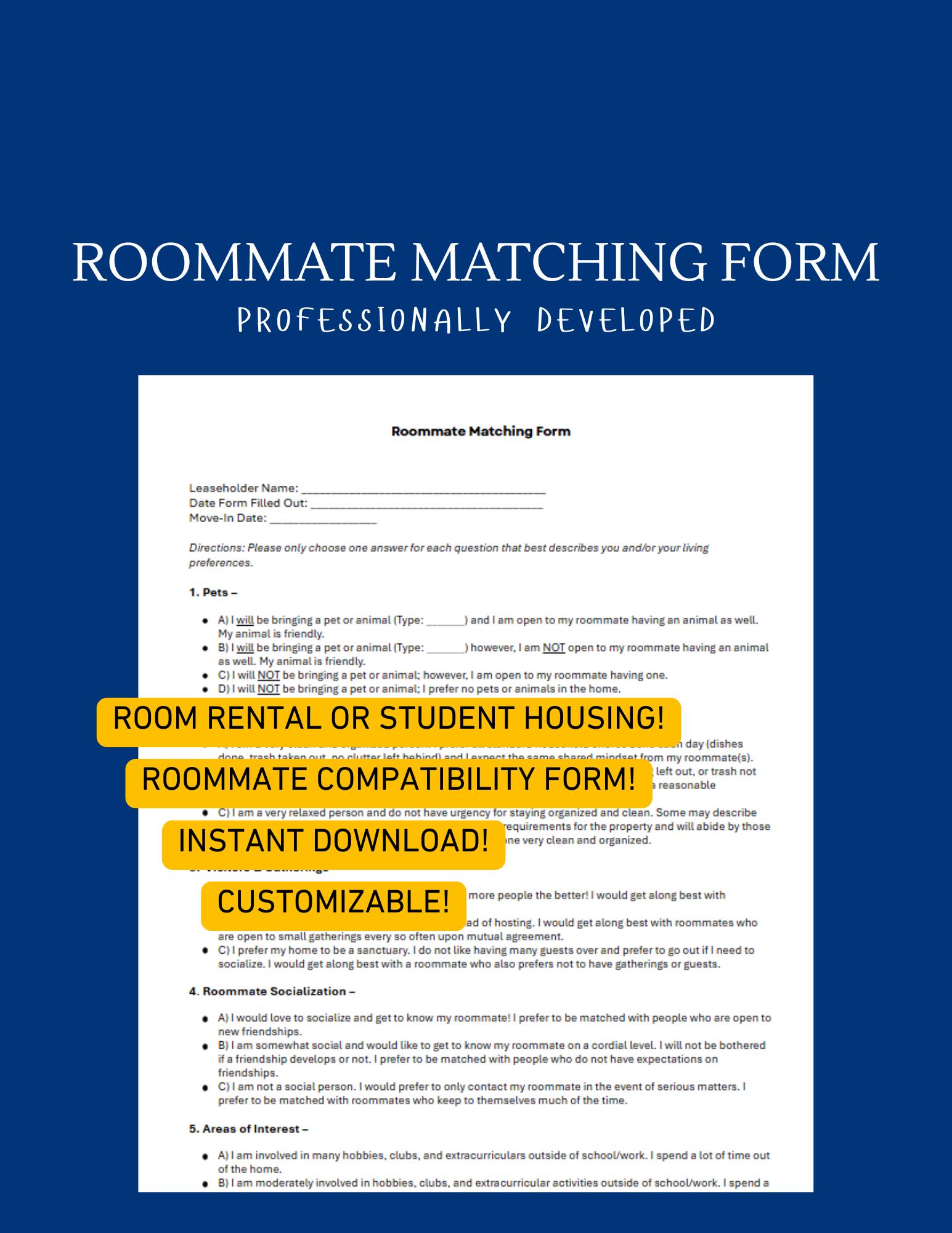 Roommate Matching Form for Rentals and Landlords - Customizable (Instant Download)